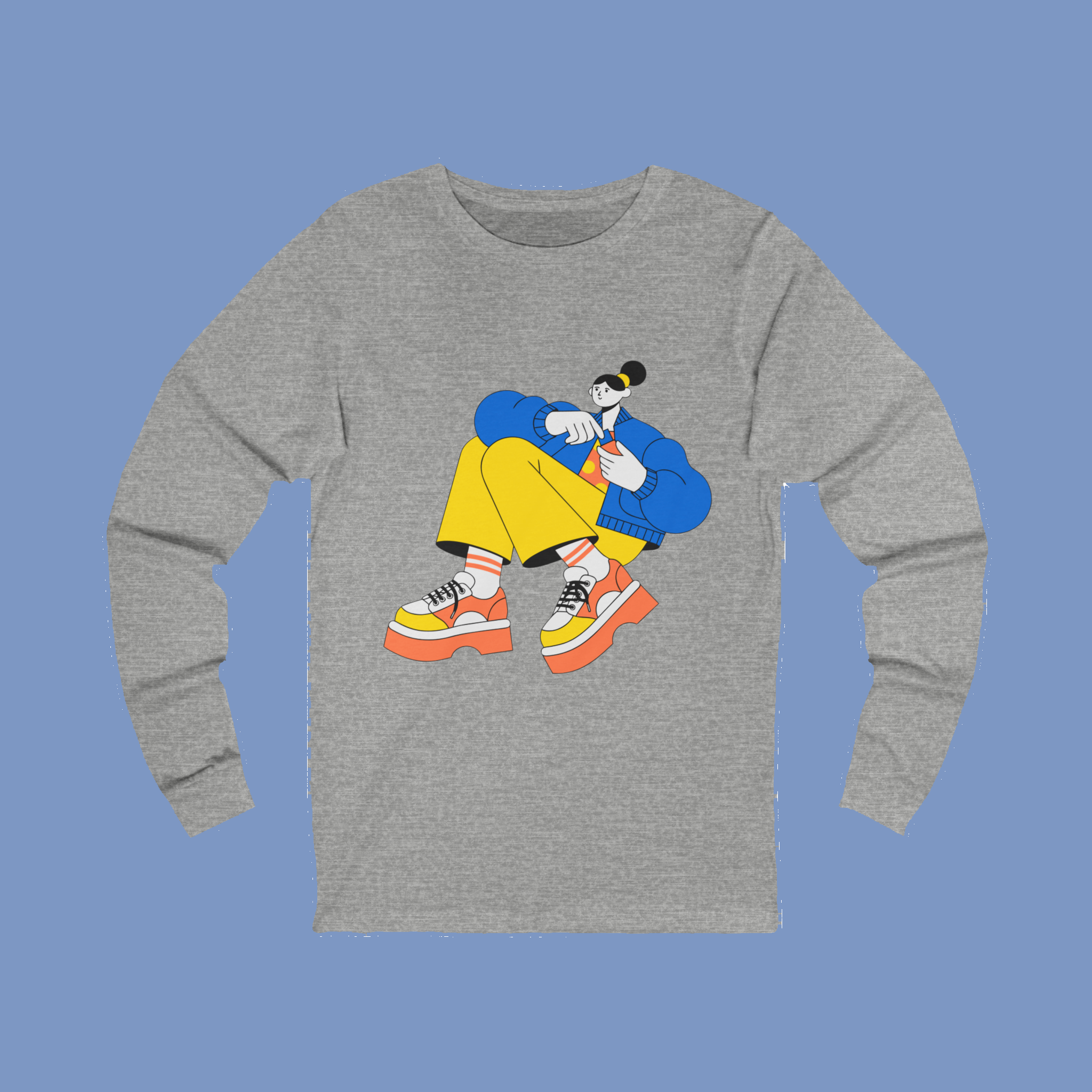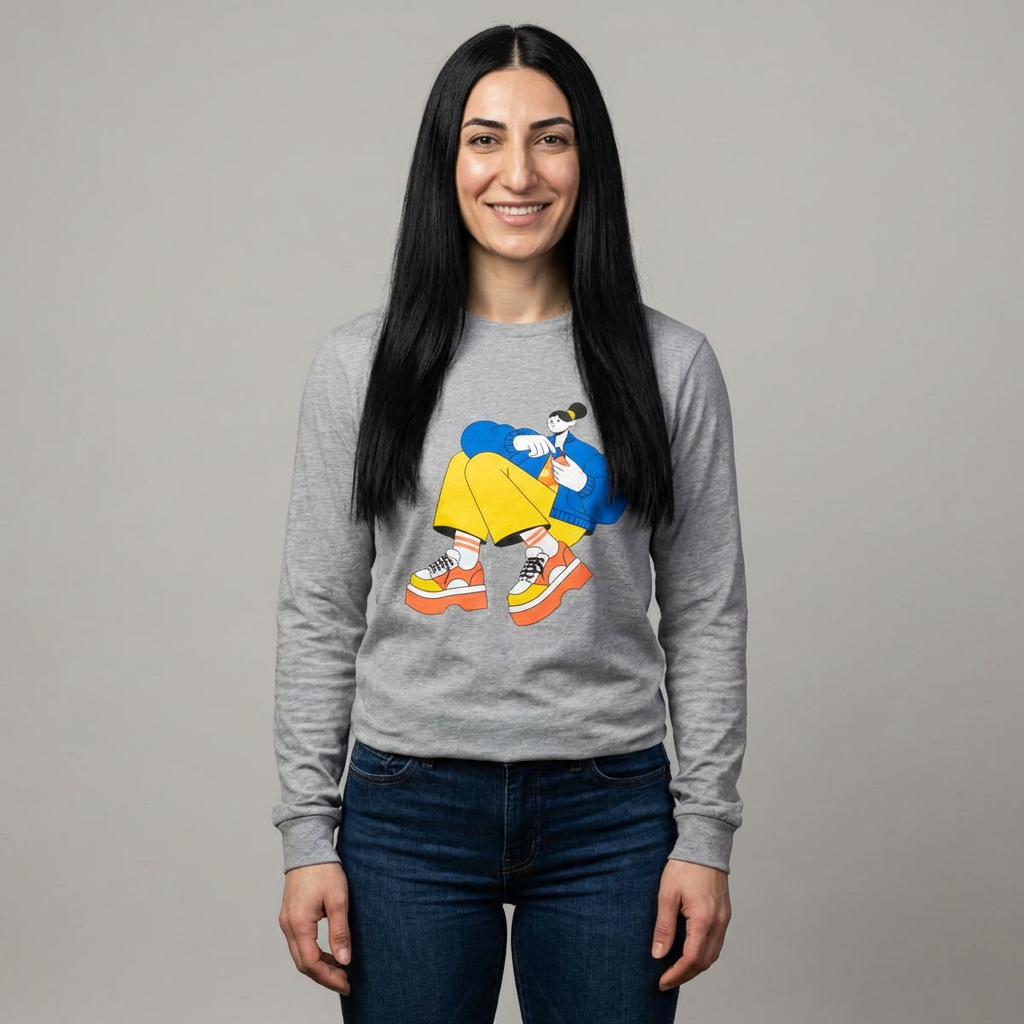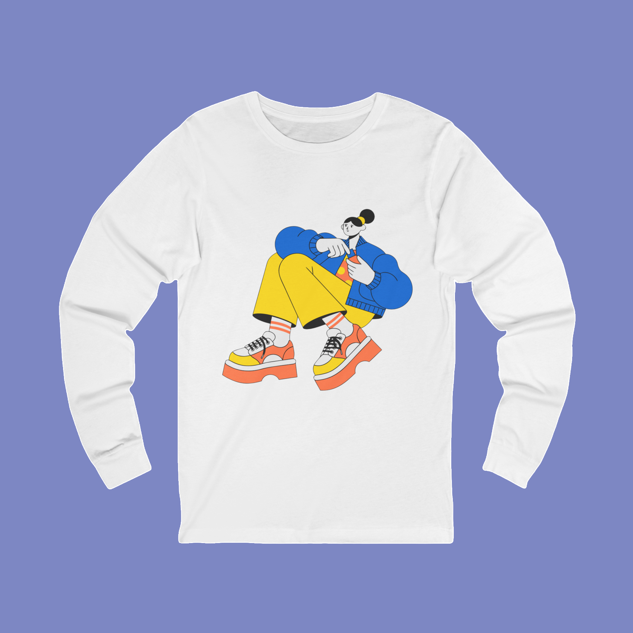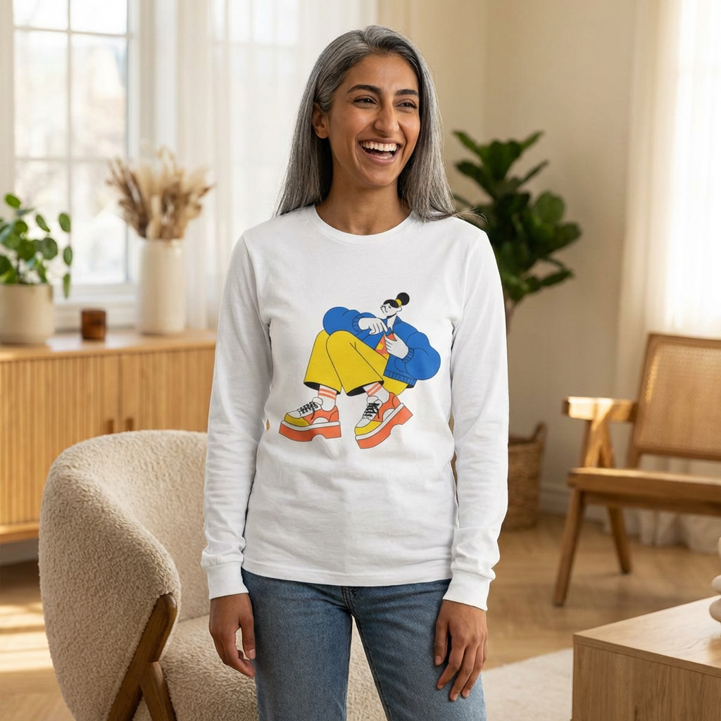 A lightweight long-sleeve tee that blends playful streetwear energy with everyday comfort. The soft, airy fabric and retail fit let the brightly illustrated character sit front-and-center, while ribbed collar and shoulder tape keep the silhouette crisp wash after wash. Wear it layered under a denim jacket on breezy afternoons or solo for relaxed weekend coffee runs. The graphic’s bold colors pop against the clean white canvas, making this tee an easy way to add personality without sacrificing comfort.