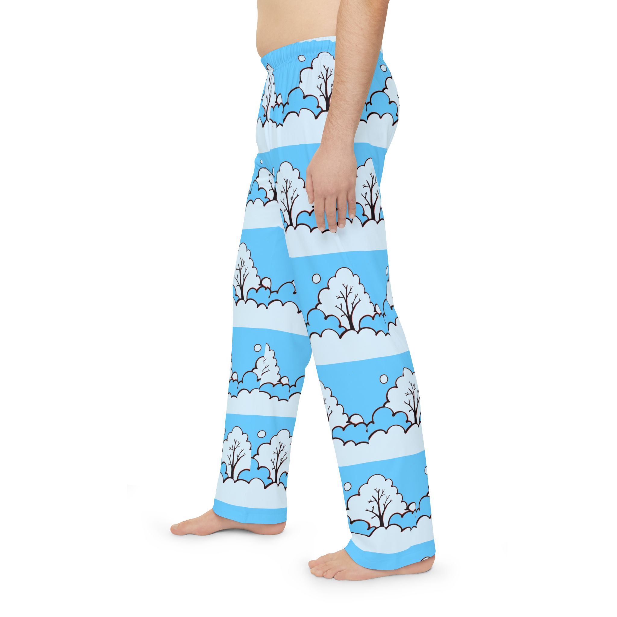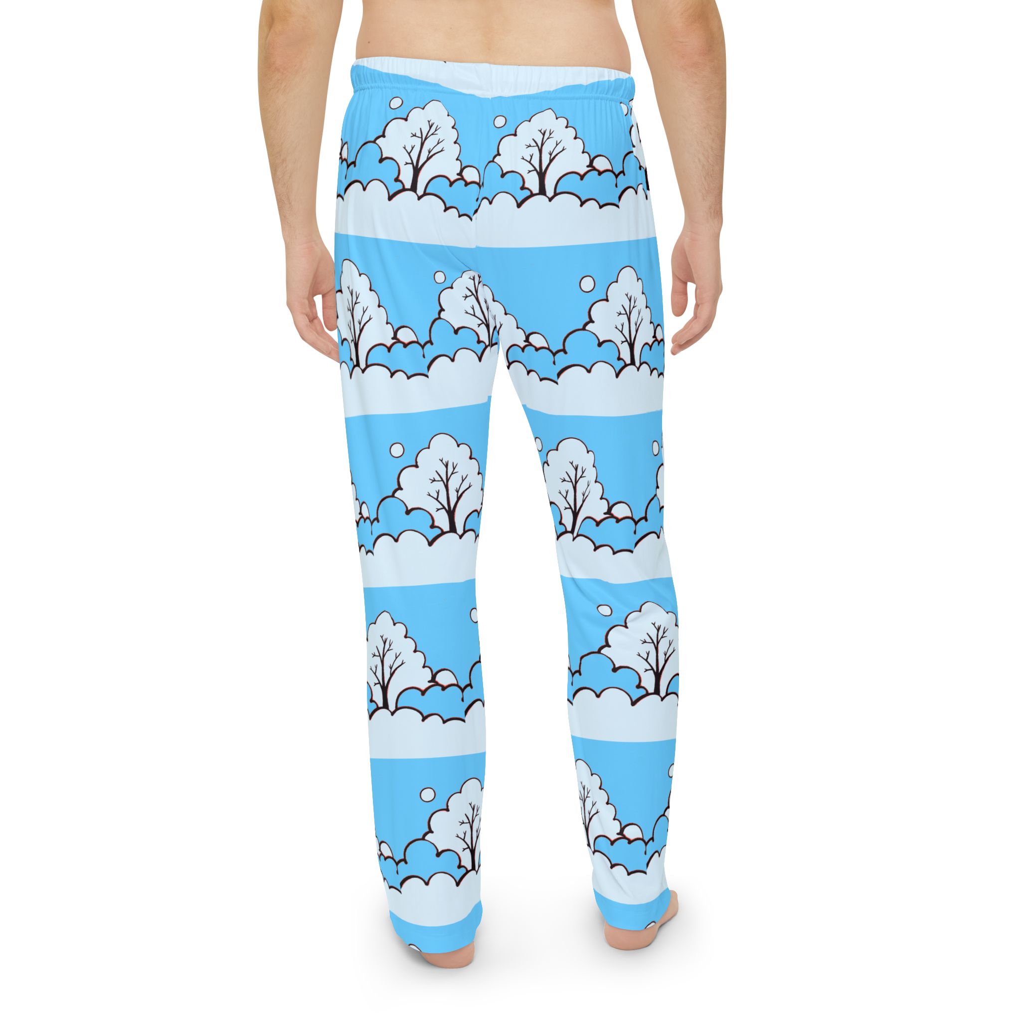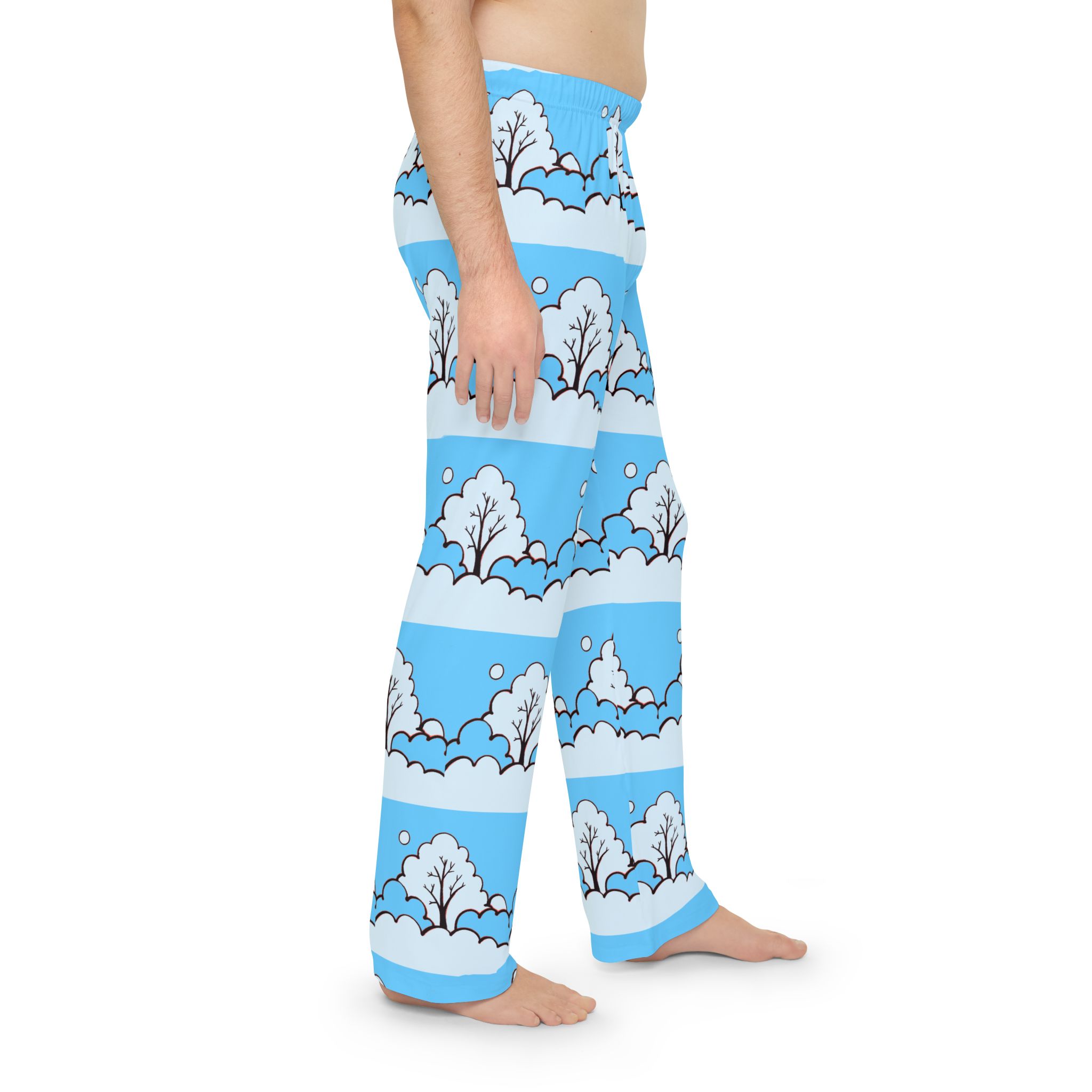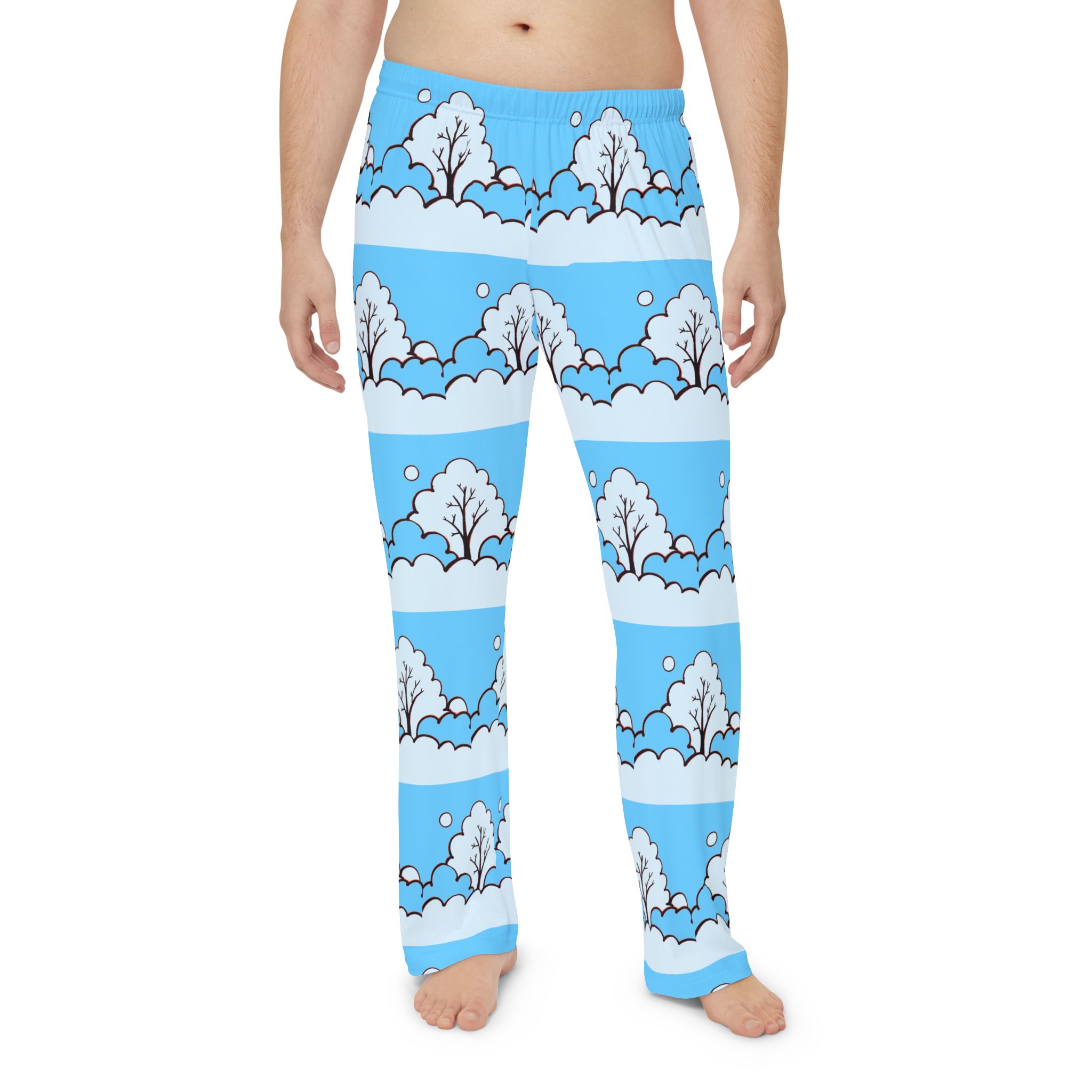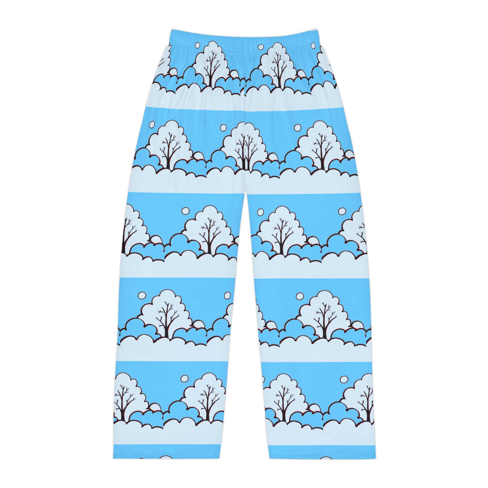 Sink into slow mornings with these lightweight pajama pants that carry a gentle winter scene across every stitch. Soft brushed polyester feels smooth against skin while the elastic waistband keeps things easy and relaxed. Pale blue bands frame simple, snowy trees and drifting snowflakes—quiet, playful artwork that reads like a stroll through a childlike winter memory. Wear them for early coffee, late-night reading, or lounging through a snow day. They move with you, wash quickly, and keep the print bright so the scene stays as calm and cheerful as the moment you put them on.